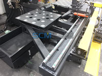 1. The machine-frame is made by C-type plate welding, with good rigidity and big handling space. The machine sets three die-stations (among them, one is the marking die-station), automatic switching die-stations. Clamping system can adapt to different workpiece, with zero baffle as datum mark, and workpiece supported by rolling-ball working table. Axis X & Y action should be controlled by servo motor and ball-screw driving, and double-axis CNC system controls the position of punching, so as to make the whole machining process automatically; operator may input the sizes of workpiece to computer for repeated calling program in the future.
